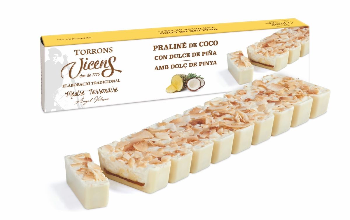 Turrones Vicens es un referente para Turrones Gourmet de Calidad y productos de Navidad. Elaborado con praliné suave de coco y una capa de piña confitada, este turrón combina frescura y cremosidad en un equilibrio perfecto. Ideal para quienes buscan sabores originales y festivos. Exquisitas elaboraciones de la mejor calidad, elaborados con los mejores ingredientes. No pueden faltar en tu mesa de Navidad. ¡Compralos al mejor precio en nuestra tienda Online de Turrones, Bombones y Especialidades Gourmet de Navidad! Son el regalo perfecto. Descubre nuestra increíble selección de Turrones Artesanos Vicens. En nuestra tienda online al mejor precio. Turrón artesano de elaboración cuidada. Elaborado por Torrons Vicens en Agramunt, maestros turroneros desde 1775. Perfecto para regalar o disfrutar en sobremesa todo el año.
